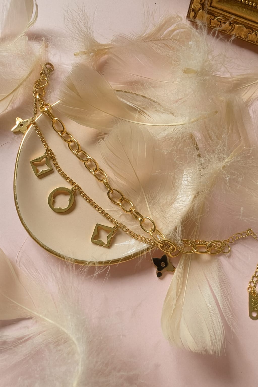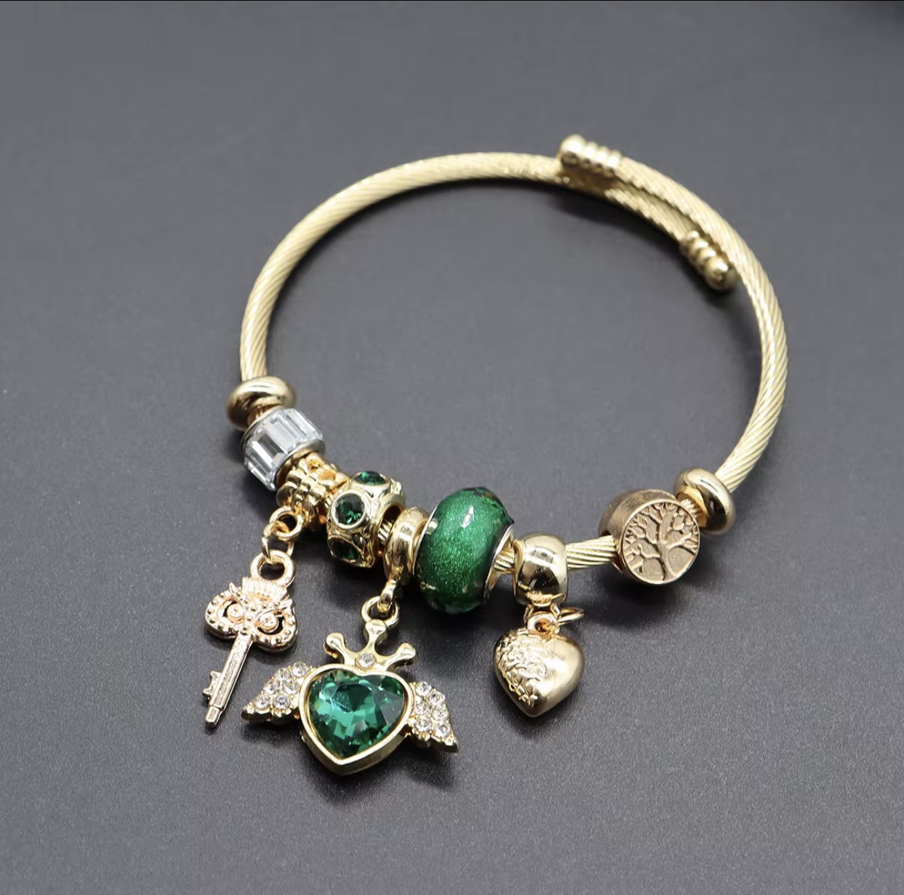 Ein luxuriöses Armband in Goldoptik mit smaragdgrünen Akzenten und detailreichen Anhängern. Ein elegantes Accessoire, das Liebe, Schutz und Eleganz vereint.