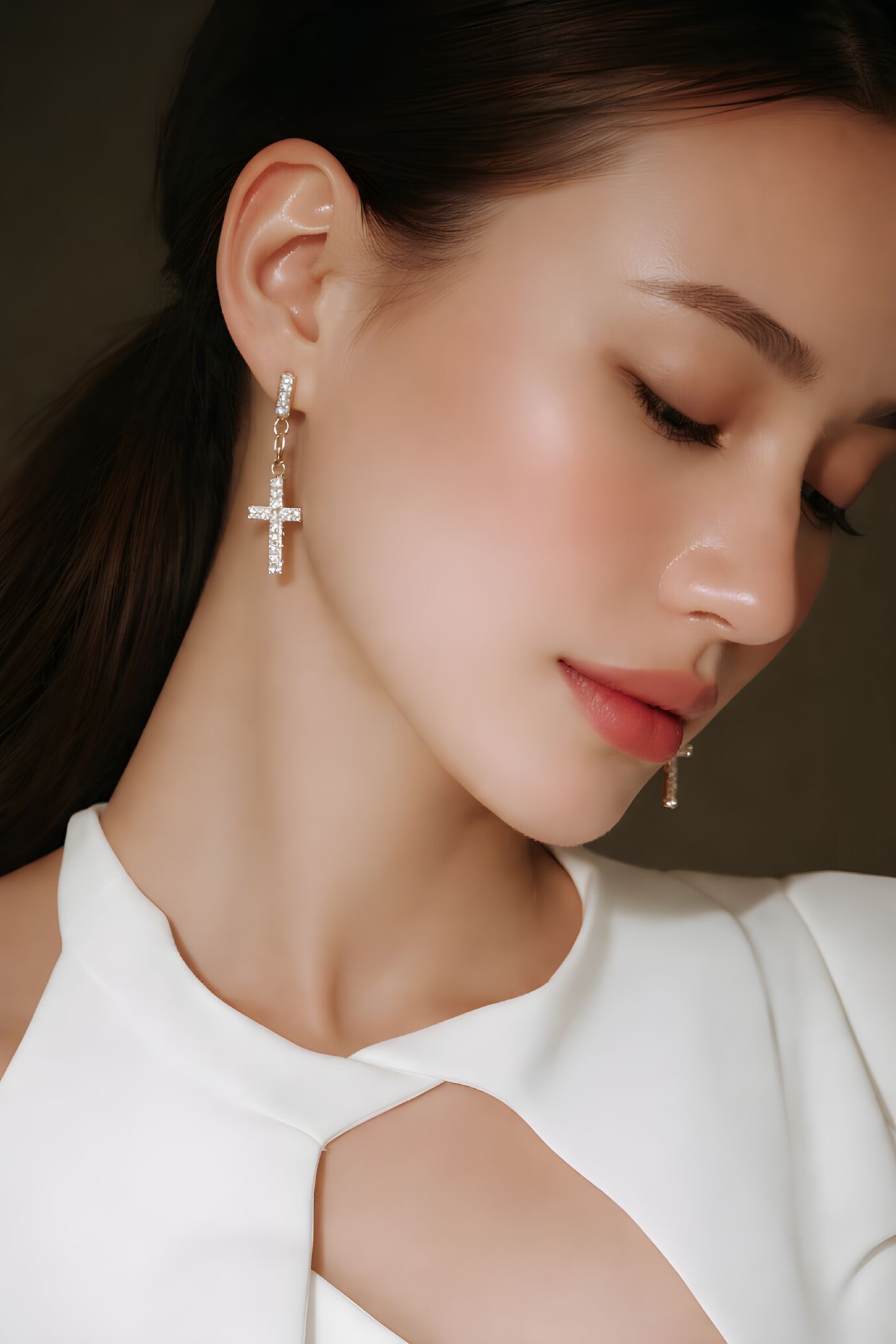 Die zarte Kette sorgt für eine feminine Leichtigkeit, während der Kreuzanhänger Stärke, Stil und Persönlichkeit symbolisiert. Diese Ohrringe sind die perfekte Wahl für besondere Anlässe, elegante Abende oder als luxuriöses Highlight im Alltag.