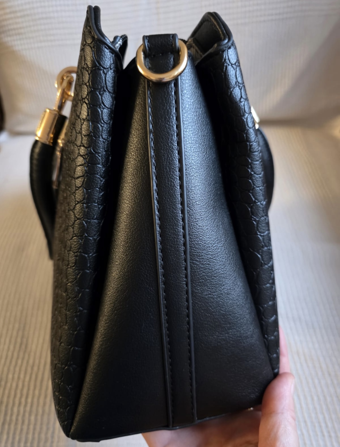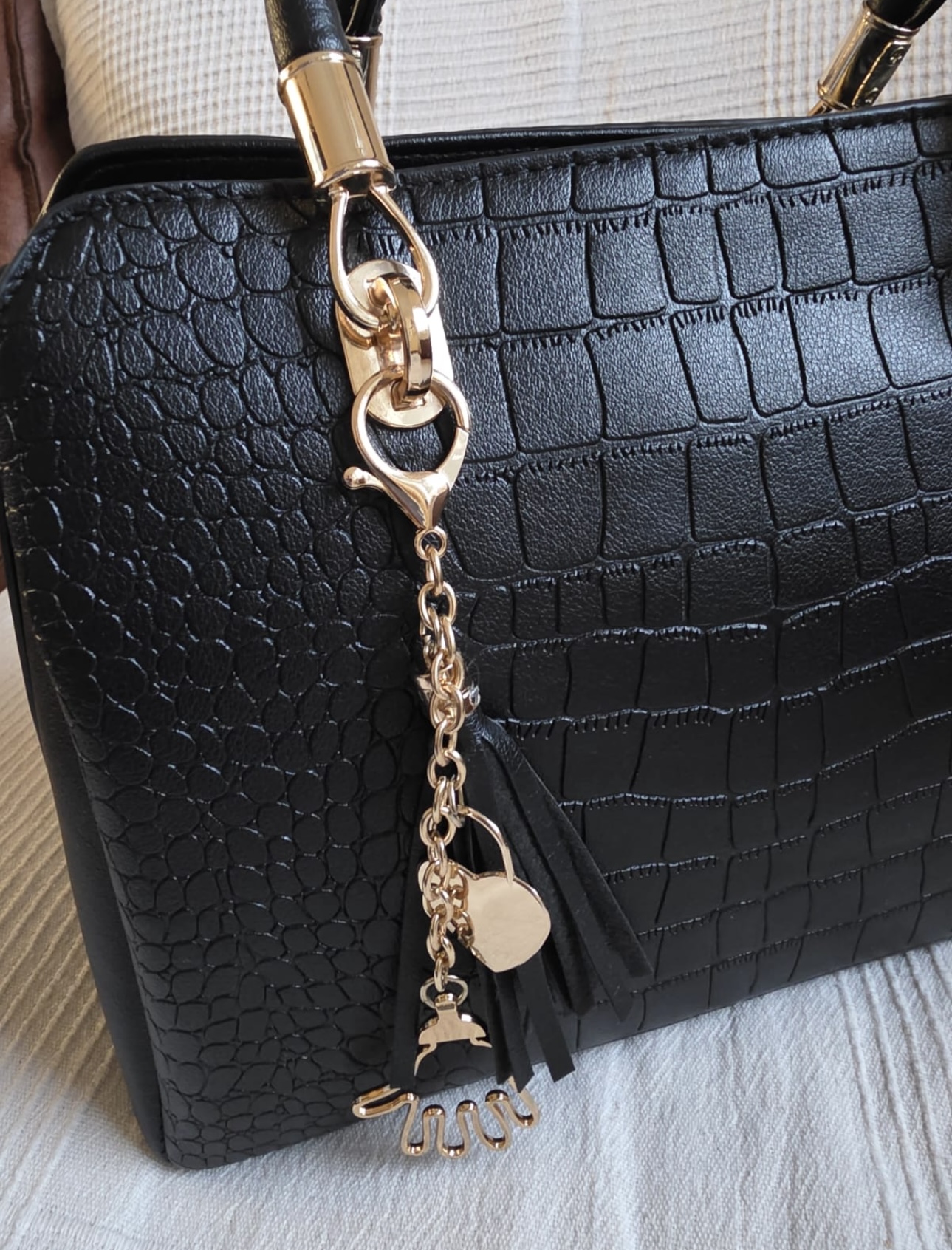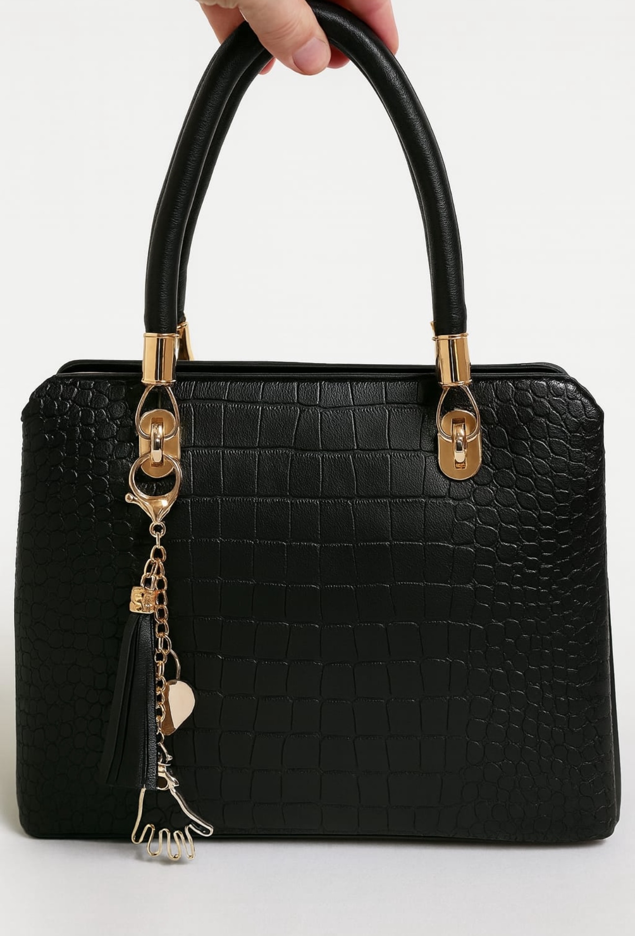 Elegante schwarze Handtasche mit edler Kroko-Prägung und goldenen Details. Perfekt für Business, Dinner oder Alltag mit Stil.