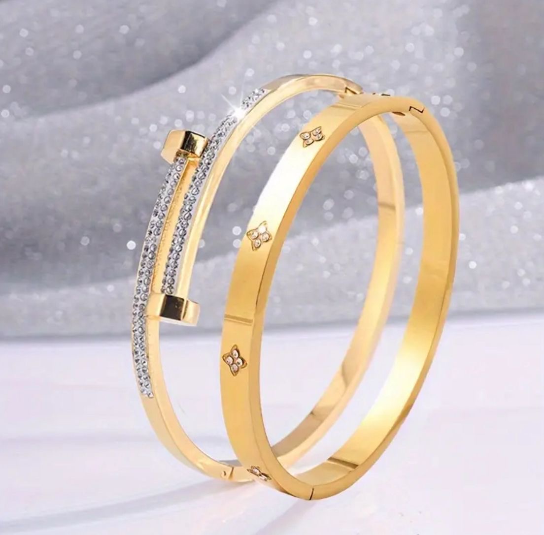 Dieser luxuriöse Doppel-Armreif vereint modernes Design mit klassischer Eleganz. Der erste Reif ist mit funkelnden Zirkonia-Steinen besetzt, die bei jeder Bewegung strahlend glitzern. Der zweite Reif besticht durch dezente Gravuren mit kleinen, eingearbeiteten Zirkonia-Details, die dem Schmuckstück eine edle Raffinesse verleihen. Gemeinsam bilden die beiden Elemente ein harmonisches Duo, das perfekt für Abendgarderobe, Business-Looks oder als täglicher Begleiter geeignet ist. Dank hochwertiger Materialien bleibt der Glanz beständig und der Armreif angenehm zu tragen.