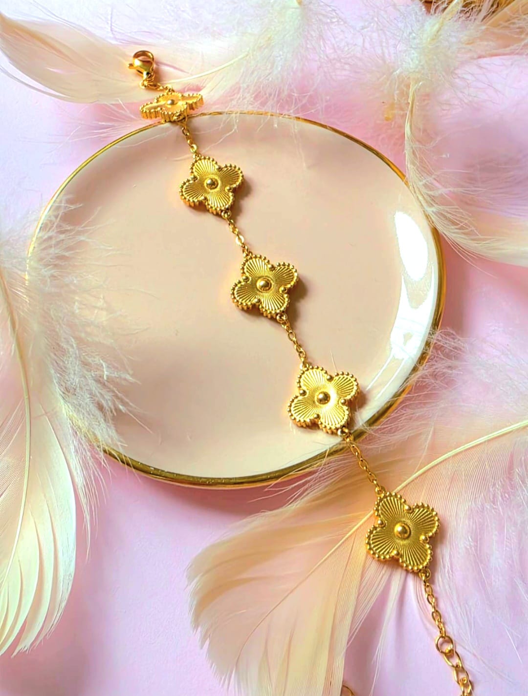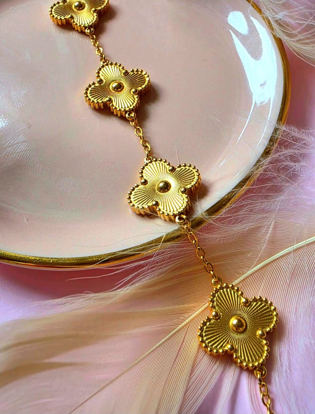 Die goldenen Kleeblatt-Elemente sind fein strukturiert und fangen das Licht mit jedem Handgriff ein – ein dezenter, aber luxuriöser Blickfang.