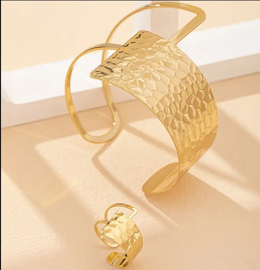 Modernes Schmuck-Set in Hammerschlag-Optik – goldfarbener Armreif und passender Ring im einzigartigen Design.