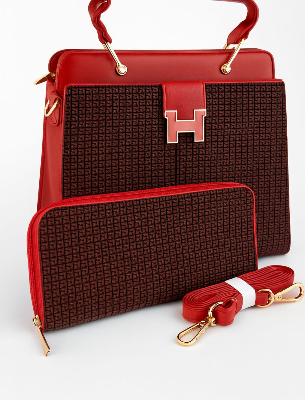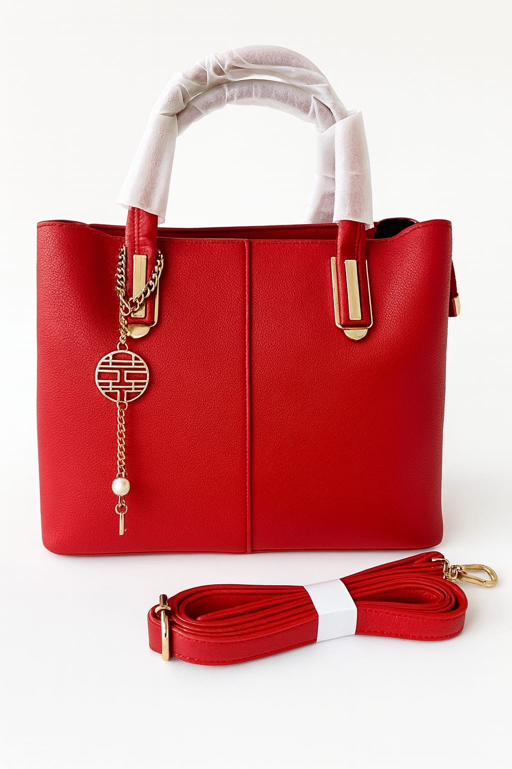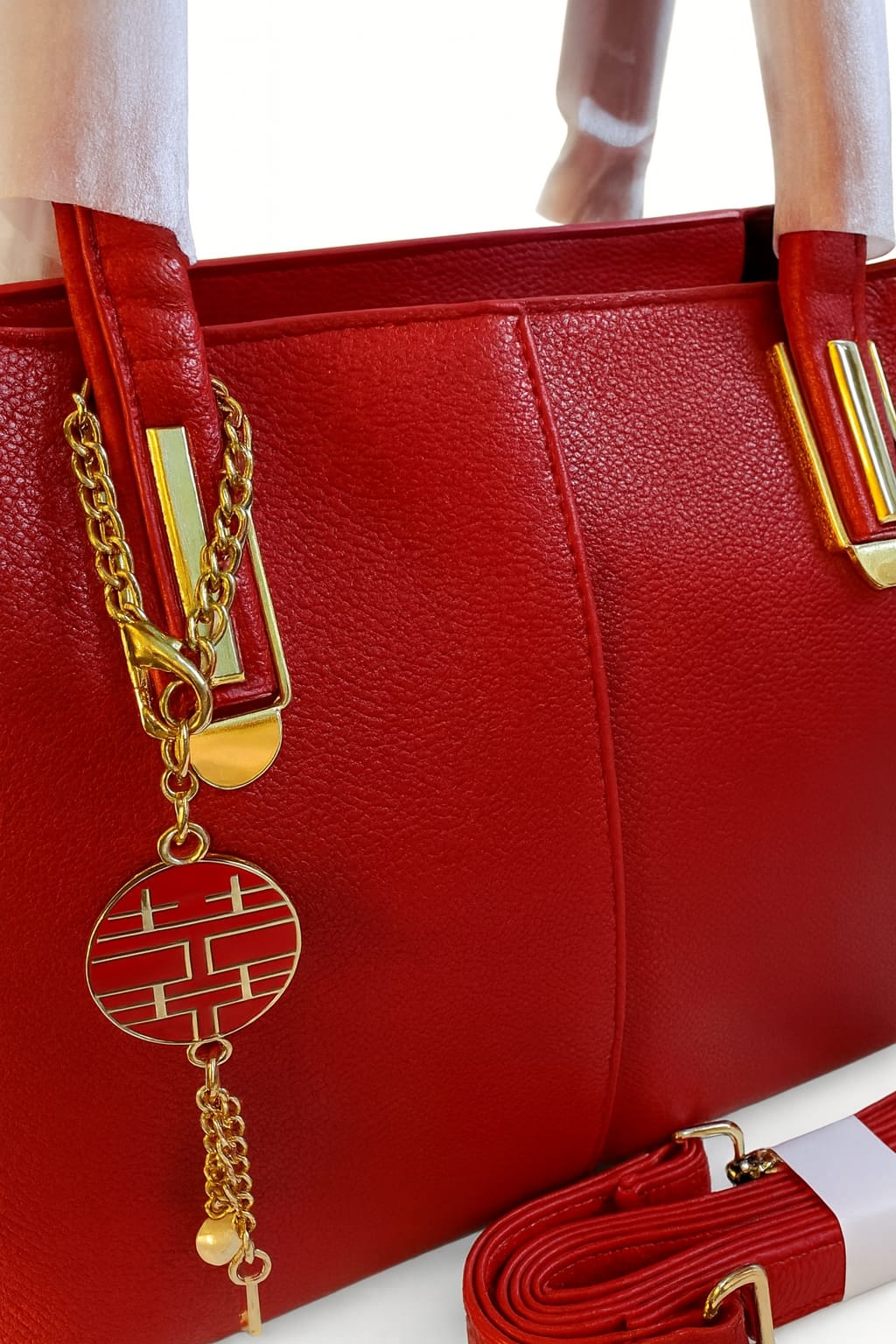 Elegante rote Handtasche mit goldenen Akzenten und abnehmbarem Umhängeband – stilvoll, modern und perfekt für jeden Anlass.